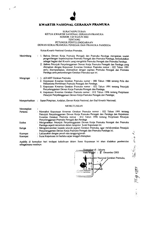 - Surat Keputusan Ketua Kwartir Nasional Gerakan Pramuka Nomor_131 Tahun 2003 Tentang Petunjuk Penyelenggaraan Dewan Kerja Pramuka Penegak Dan Pramuka Pandega